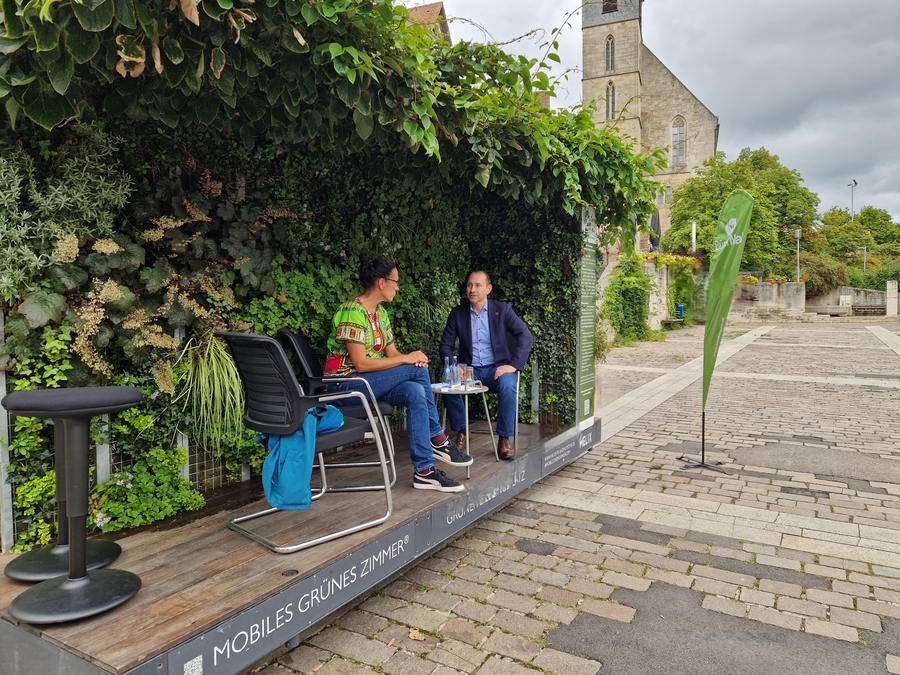 * Das „Mobile Grüne Zimmer“ ist ein rundum bepflanztes Modul, das als grüne Oase insbesondere an warmen Sommertagen Abhilfe schaffen soll. Das zentrale Element ist eine freistehende Grünwand aus Blattschmuck-, Blüh- und Naschpflanzen mit einem bewachsenen Dach aus Kiwipflanzen. Die darunterliegende Sitzfläche aus Holz bietet Raum für Erholung, Austausch, Aktionen und Veranstaltungen. Im Sommer 2025 war das MGZ an drei unterschiedlichen Standorten in Böblingen verortet.