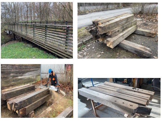 Diese wurden aufbereitet indem sie gesägt, gehobelt/ gebürstet und mit unterschiedlich großen Bohrungen versehen wurden. Um einen dauerhafteren Einsatz zu gewähren wurden die Eichenbalken auf stählerne Pfostenschuhe montiert.