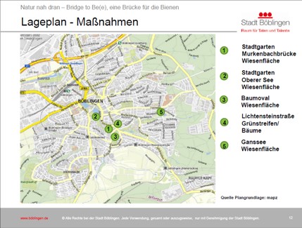2022 bewarb sich die Stadt Böblingen für das Förderprogramm „Natur nah dran“. Dieses wurde vom NABU Naturschutzbund Baden Württemberg konzipiert und unterstützt. Das Ministerium für Umwelt, Klima und Energiewirtschaft stellt die Fördermittel. 2023 war Böblingen „Natur nah dran“ Kommune. Es wurden an 5 Standorten fast 2.500 Quadratmeter blütenreiche Standorte mit gebietsheimischem Saatgut angelegt.