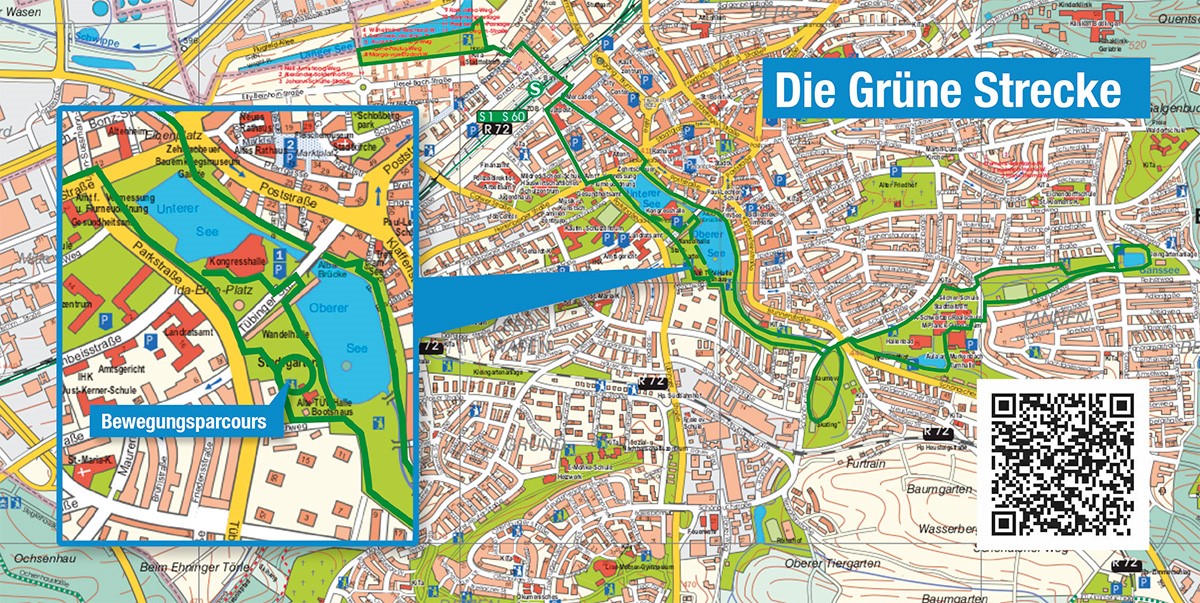 Start im Stadtgarten Nähe Mönchweg /Alte TÜV-Halle, von dort durch den Stadtgarten zum Baumoval, einmal umrunden (Nähe Skateranlage). Wir überqueren die Schönbuchstraße, links halten, unterqueren die Schönaicher Straße, halten uns rechts im Grünzug parallel zur Schönaicher-Straße. Biegen hinter dem See links ab, halten uns rechts durch das Murkenbach-Gelände.Überqueren den Murkenbachweg, kurz links halten, dann rechts in die Bussardstraße (Sportflächen) bis zum Schwalbenweg, hier kurz links. Rechts liegt der Ganssee, den wir einmal umrunden. Zurück auf dem Schwalbenweg kurz rechts, dann links durchs Grüne und über die Keilbergstraße (Nähe Spielplatz) vor bis zum Murkenbachweg, überqueren (Nähe Murkenbachstube), weiter durchs Grüne am nördlichen Murkenbach-Gelände (Spielplatz Murkenbach) bis zum Murkenbach, kurz rechts und links in die Achalmstraße.Die Schönaicher Straße wieder unterqueren, kurz zum Baumoval, rechts die Schönbuchstraße überqueren, über die Brücke in den Stadtgarten, vor bis zu den Seen, immer geradeaus (Treff am See) bis zum Elbenplatz. Den überqueren.Der Bahnhofstraße (Fußgängerzone) folgen, die Schienen am Bahnhof unterqueren. Auf dem Flugfeld vor bis zum Langen See (Spielplatz Grüne Mitte). Hier links, dem See folgen, wieder links und vor der Bebauung zurück zum Bahnhof.Kurz rechts in die Talstraße, gegenüber in die Karlstraße einbiegen, vor bis zur Herrenberger Straße. Diese kreuzen und zwischen Parkstraße und Seen durch die Wandelhalle bis zum Ausgangspunkt Bewegungsparcours folgen.Abschnitt 1,5 km: rund um die Seen.Abschnitt gut 3 km: a) Flugfeld – Stadtgarten - Flugfeld; b) Stadtgarten und BaumovalAbschnitt knapp 5 km: Ganssee – Stadtgarten – Ganssee.Gesamtstrecke: knapp 9 km – leichte Streckenabschnitte.