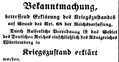 Zunächst hatte man in Böblingen, das in tiefstem Frieden lebte, wie andernorts auch, die Tragweite des Attentats nicht erkannt. Als dann am Freitag, den 31. Juli 1914 zwischen 17.00 und 18.00 Uhr unter Trommelwirbel der Kriegszustand verkündet und am folgenden Tag die Reservisten einberufen wurden, stürzte dies die Böblingerinnen und Böblinger in ein Wechselbad der Gefühle. Wacker schreibt: „Darum gehen sie [die Böblinger] auf die Straße und stehen in Gruppen beisammen, um voneinander Hilfe und Trost zu suchen. Dazu steigern die folgenden Tage die Bestürzung noch.“ Es gab aber auch eine große Menschenmenge auf dem Marktplatz, die „vaterländische“ Lieder sang.