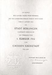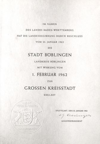 Für den Oberbürgermeister war es sogar noch mehr, er verglich das Ereignis in seiner Bedeutung mit der Stadterhebung Böblingens durch die Pfalzgrafen von Tübingen rund 700 Jahre zuvor. Nach dem Aufbau zu einer Stadt war das mittelalterliche Böblingen damals auch im rechtlichen Sinn zu einer solchen erhoben worden. Aus diesem Blickwinkel war die Stadt Böblingen durch Wiederaufbau seit 1945 und Erhebung zur Großen Kreisstadt 1962 ein zweites Mal gegründet worden.