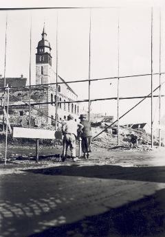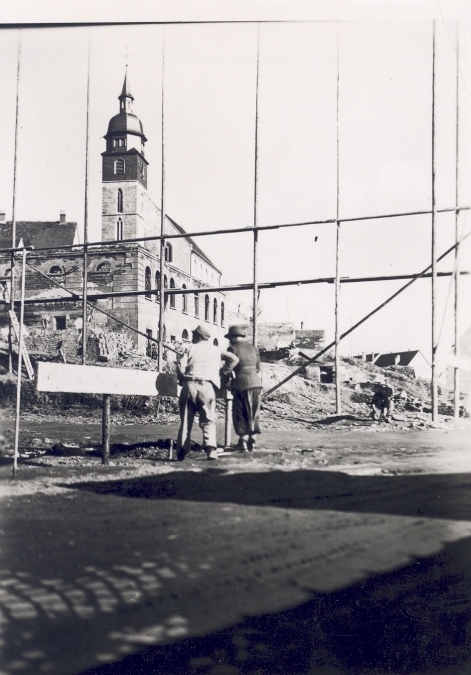 Sie wurde mit großzügigem Grundriss wieder aufgebaut. Das 1948 systematisch begonnene Werk fand mit der Vollendung des neuen Markplatzes 1958 seinen Abschluss. Die Wiedererrichtung der Stadtkirche (1949 bis 1950) und der Neubau des Rathauses (1951 bis 1952) waren die zentralen Bauvorhaben. Die Bilanz war beeindruckend. Bis 1962 gelangt es unter schwierigsten Bedingungen rund 7.500 Wohnungen zu errichten. Eine Leistung, die ohne die Mitarbeit der ganzen Bevölkerung nicht möglich gewesen wäre.