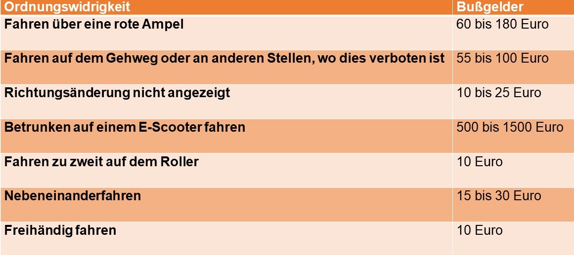 E‐Scooter unterliegen, wie alle anderen Fahrzeuge auch, der Straßenverkehrsordnung (StVO). Im Zuge ihrer Zulassung wurde der bundeseinheitliche Tatbestandskatalog des Kraftfahrt‐Bundesamtes um die Nutzung von Elektrokleinstfahrzeugen ergänzt, ein Verstoß zählt zu den Verkehrsordnungswidrigkeiten. Hier können die Bußgelder für typische Verstöße eingesehen werden: