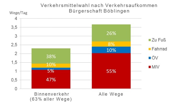 Die Böblinger Bürgerschaft legt im Durchschnitt pro Tag 3,7 Wege zurück. Der Großteil der Wege (55%) wird mit dem motorisierten Individualverkehr (MIV) zurückgelegt. Dazu gehören unter anderem das Auto und Motorräder. 26% der Wege werden zu Fuß bewältigt, 10% mit öffentlichen Verkehrsmitteln und 8% mit dem Rad. Eine ähnliche Verteilung ist auch bei Wegen innerhalb des Stadtgebiets zu beobachten, dem sogenannten Binnenverkehr. Das Forschungsprojekt SrV hat gezeigt, dass dieser Modal Split typisch ist für Mittelzentren mit einer hügeligen Topografie.