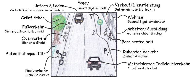 Die Grafik zeigt, dass bei der Stadt- und Verkehrsplanung viele verschiedene Nutzergruppen berücksichtigt werden müssen, da sie sich alle Nutzergruppen denselben Straßenraum teilen. Da die Stadt gebaut ist, muss Mobilität als Ganzes betrachtet werden und Kompromisse gefunden werden. Mit dem neuen „Mobilitätskonzept 2020“ soll diese gesamtheitliche Betrachtung umgesetzt werden