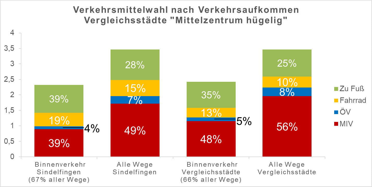 Um die Ergebnisse der Studie besser einordnen zu können erstellt die TU Dresden Auswertungen für Vergleichsstädte. Hierbei spielt die Topographie und die Einwohnerzahl eine Rolle. Die Stadt Böblingen gehört genauso wie Sindelfingen zur Kategorie „Mittelzentrum hügelig“. Die Werte für den Modal Split sind bei Böblingen und den Vergleichsstädten nahezu identisch. Sindelfingen hat einen geringeren MIV-Anteil zugunsten des Radverkehrs. Im Nachbarlandkreis Tübingen hat die Stadt Tübingen an der Erhebung teilgenommen. Der Modal Split der Universitätsstadt unterscheidet sich trotz der hügeligen Struktur erheblich von Böblingen. Die Tübinger Bevölkerung legt 32% aller Wege mit dem MIV zurück, 30% zu Fuß, 23 % mit dem Rad und 15% mit dem ÖV. Im Binnenverkehr ist der Anteil von Fuß- und Radverkehr sogar noch höher. Der MIV Anteil beträgt für Wege innerhalb der Stadt nur 24%.