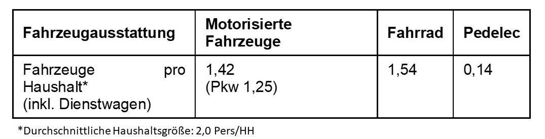 Bei der SrV Erhebung wird auch abgefragt welche Verkehrsmittel in den Haushalten bzw. im näheren Umfeld zur Verfügung stehen und wie oft diese grundsätzlich genutzt werden: