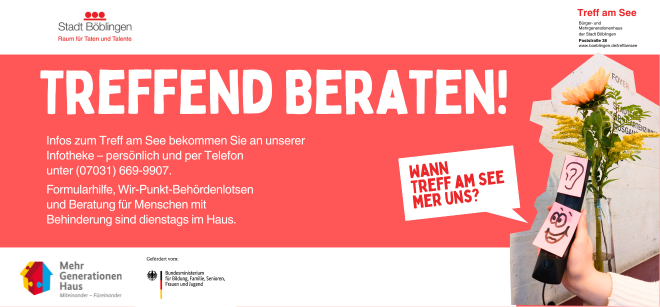 Das Bundesministerium für Familie, Senioren, Frauen und Jugend fördert das Mehrgenerationenhaus (MGH) der Stadt Böblingen seit November 2007. Das MGH im Treff am See steht allen Generationen und Kulturen zur vielfältigen Nutzung offen.