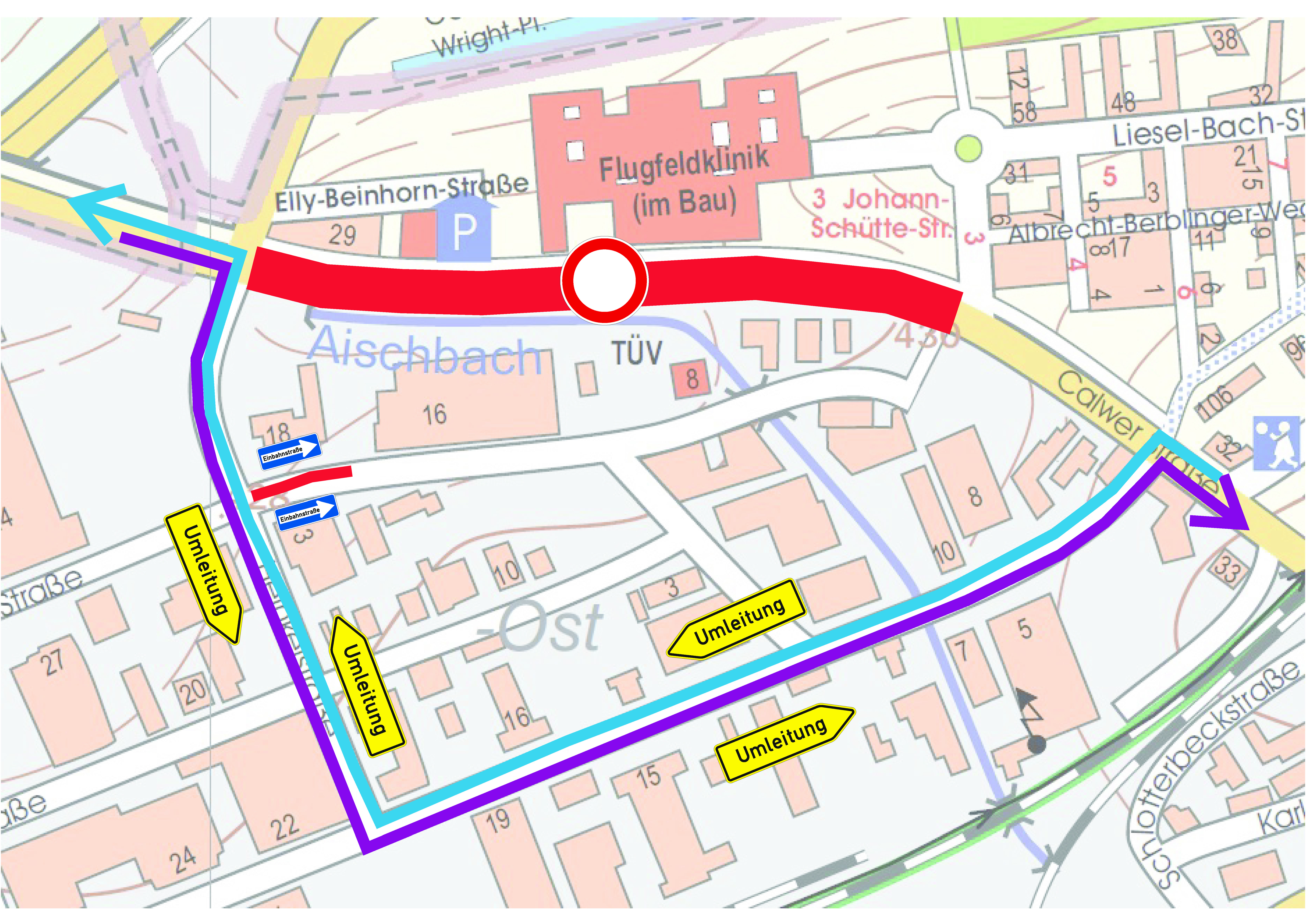 Eine Umleitung erfolgt über Calwer Straße – Heinkelstraße zur Hanns-Klemm-Straße und umgekehrt.