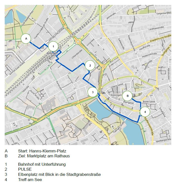 Startpunkt ist der Konrad-Zuse-Platz mit Zugang zum Bahnhof vom Flugfeld aus. Von dort geht es mit Bus und S-Bahn quer durch Böblingen. Unterwegs gibt es an Haltepunkten wie dem Bahnhof, der S-Bahn-Haltestelle Goldberg sowie an exemplarisch ausgewählten Bushaltestellen spannende Einblicke in die städtische Verkehrsplanung und Informationen zu aktuellen Projekten rund um Mobilität mit den „Öffis“ und der entsprechenden Infrastruktur. Der Abschluss ist am Busbahnhof.
