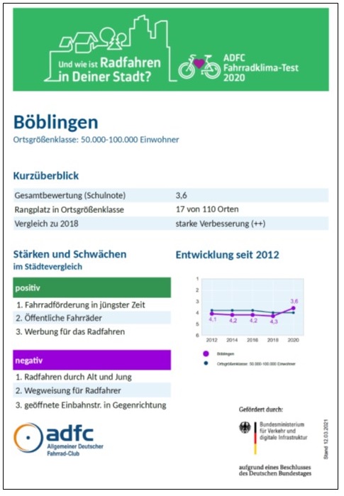 2020 bewerteten knapp 230.000 Radfahrer*innen die Fahrradfreundlichkeit in über 1.000 Städten und Gemeinden. Böblingen gewann damals die Kategorie „Aufholer“ der mittelgroßen Städte für die beste Entwicklung. Der ADFC-Fahrradklima-Test fragt in 27 gleichbleibenden Fragen die Fahrradfreundlichkeit vor Ort ab. Dazu kommen dieses Jahr fünf Zusatzfragen, die besonders auf die Bedürfnisse von kleineren Orten im ländlichen Raum abzielen. Hier geht es darum, ob zentrale Ziele wie Schulen, Einkaufsmöglichkeiten oder Arbeitsstätten mit dem Fahrrad gut erreichbar sind,