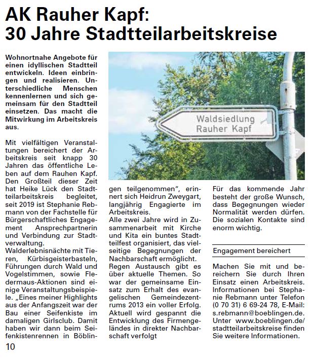 Einen Überblick über 30 Jahre Stadtteilarbeitkreise und ein Dankeschön gibt es unter Amtsblatt Beiträgen und hier auf Seite 1 Amtsblatt KW 49. (630,1 KiB) Auf den Internetseiten der einzelnen Arbeitskreise sind die Amtsblatt-Artikel veröffentlicht und werden die AKs Kernstadt , Diezenhalde, Grund und Rauher Kapf vorgestellt.