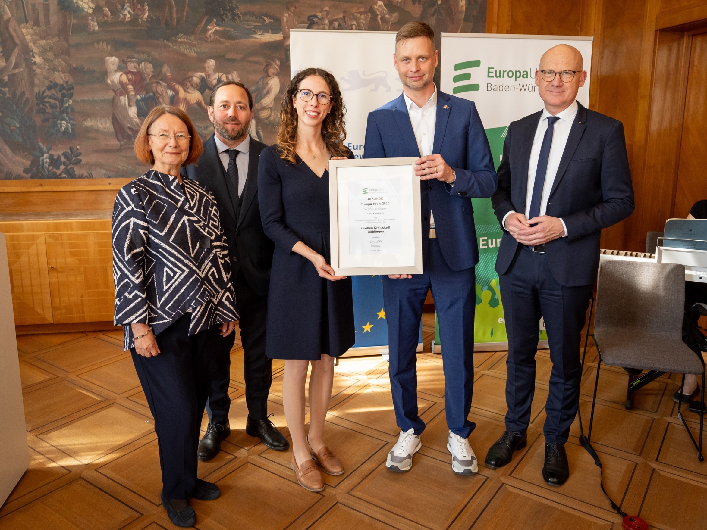 Erster Bürgermeister Tobias Heizmann und Daniela Kaufmann, Leiterin der Abteilung Gemeinderat, Kommunalverfassung und internationale Angelegenheiten, haben die Auszeichnung am 9. Mai 2025 im Staatsministerium Baden-Württemberg entgegengenommen. Sie unterstreicht die Bedeutung lokaler Europaarbeit, hebt Böblingens Einsatz für ein geeintes, starkes Europa hervor und motiviert, in dem pro-europäischen Engagement nicht nachzulassen.