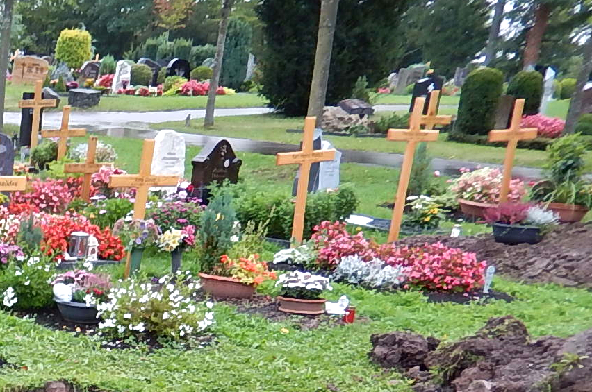 Folgende Reihengräber auf dem Waldfriedhof wurden nur für die Dauer der Ruhezeit (25 Jahre) der Verstorbenen abgegeben. Die letzten Ruhezeiten werden im Dezember 2025 ablaufen. Feld F Abteilung I, Reihe 8, Nummer 1-6