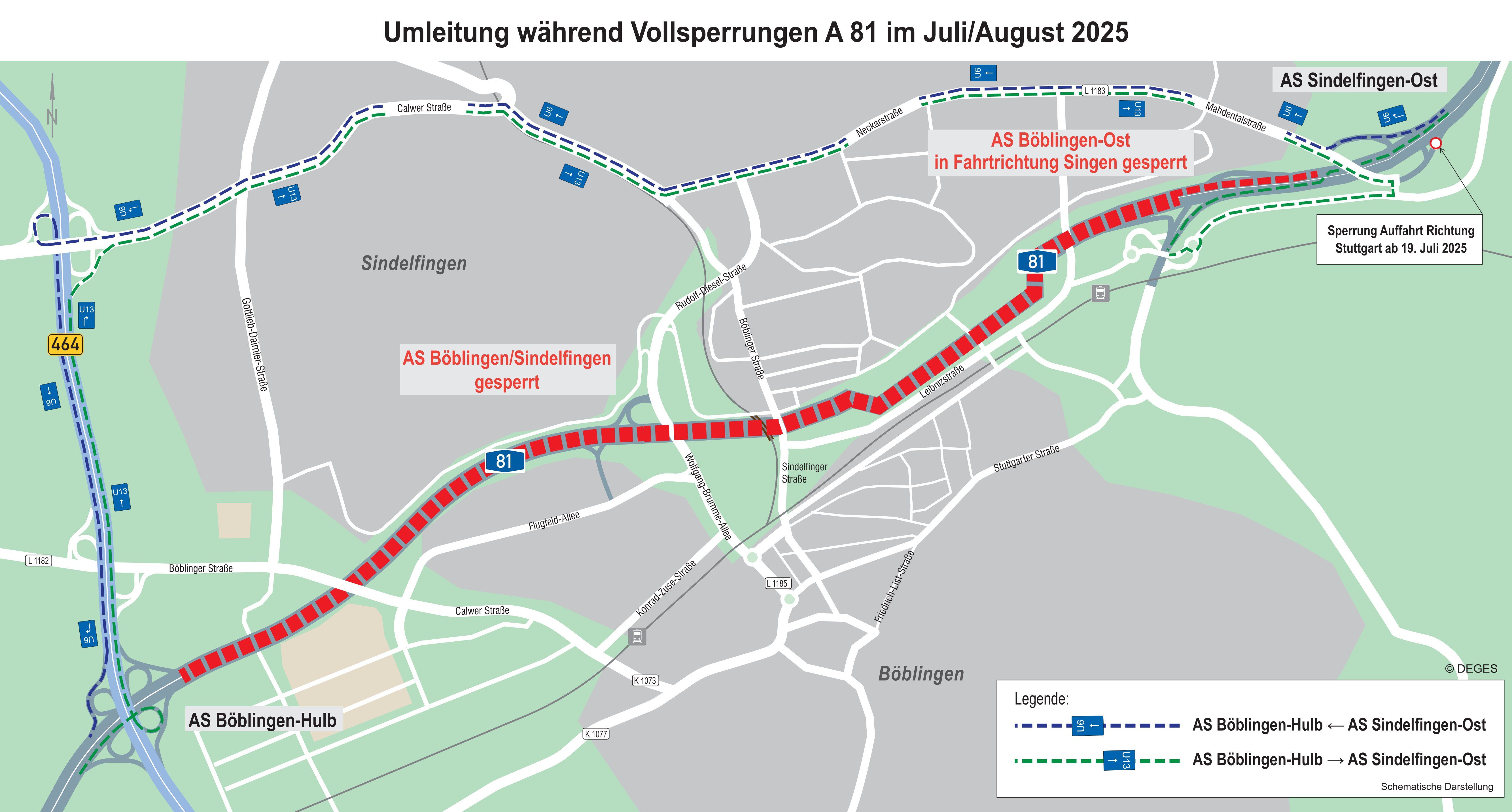 Die DEGES (Deutsche Einheit Fernstraßenplanungs- und -bau GmbH) informiert in Zusammenhang mit der Erweiterung der A 81 zwischen den Anschlussstellen Sindelfingen-Ost und Böblingen-Hulb über die Sperrung der Anschlussstelle Böblingen-Ost.